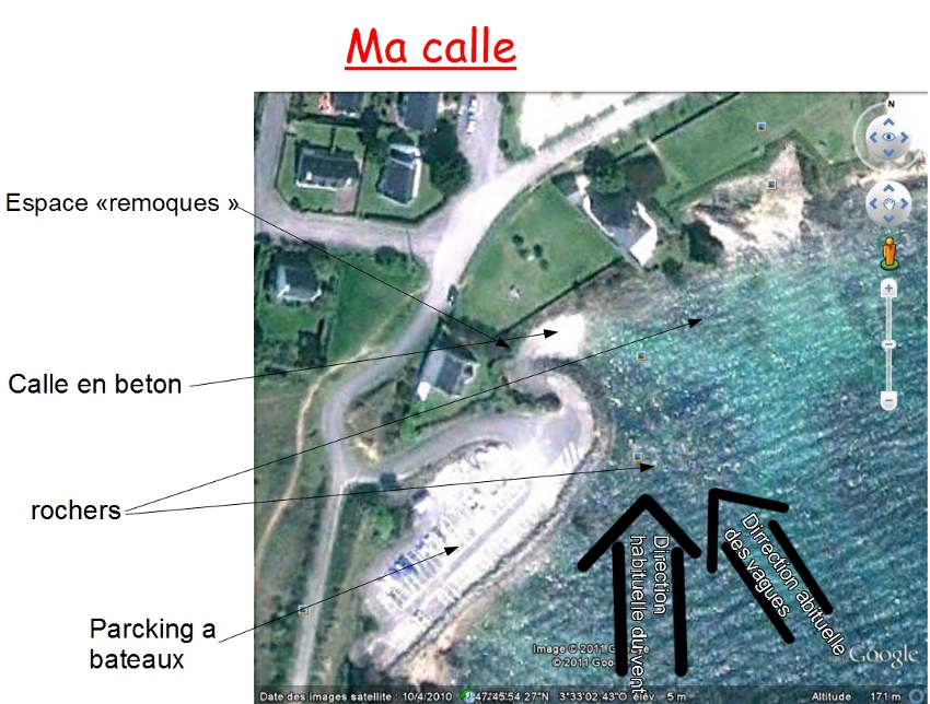 je vois ecplique je suis sur une calle en beton bien utilisée il y as des reochers a droite et a gauche (de plus les vagues poussent avec pas mal de force mon V a droite