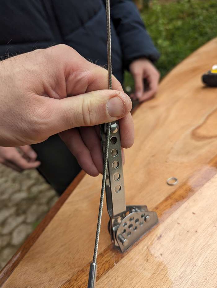 Si ensuite les haubans sont toujours trop courts, tu peux mettre une deuxième latte ridoir à trou trou pour prolonger la première. Cela permet de naviguer en attendant mieux.