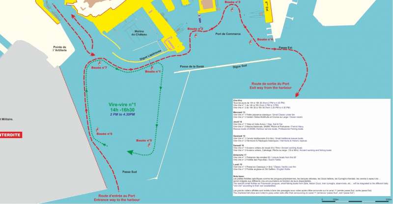 Vire-vires: Des bouées de parcours seront mouillées pour que chaque jour, de 14h00 à 16h30, des skippers puissent se montrer mutuellement leur savoir-faire et offrir un spectacle nautique au public selon le programme suivant: // Everyday, from 2pm to 4.30pm, buoys will be settled so that skippers will be able to show their talents. They will in hence offer a wonderful nautical show to the public: