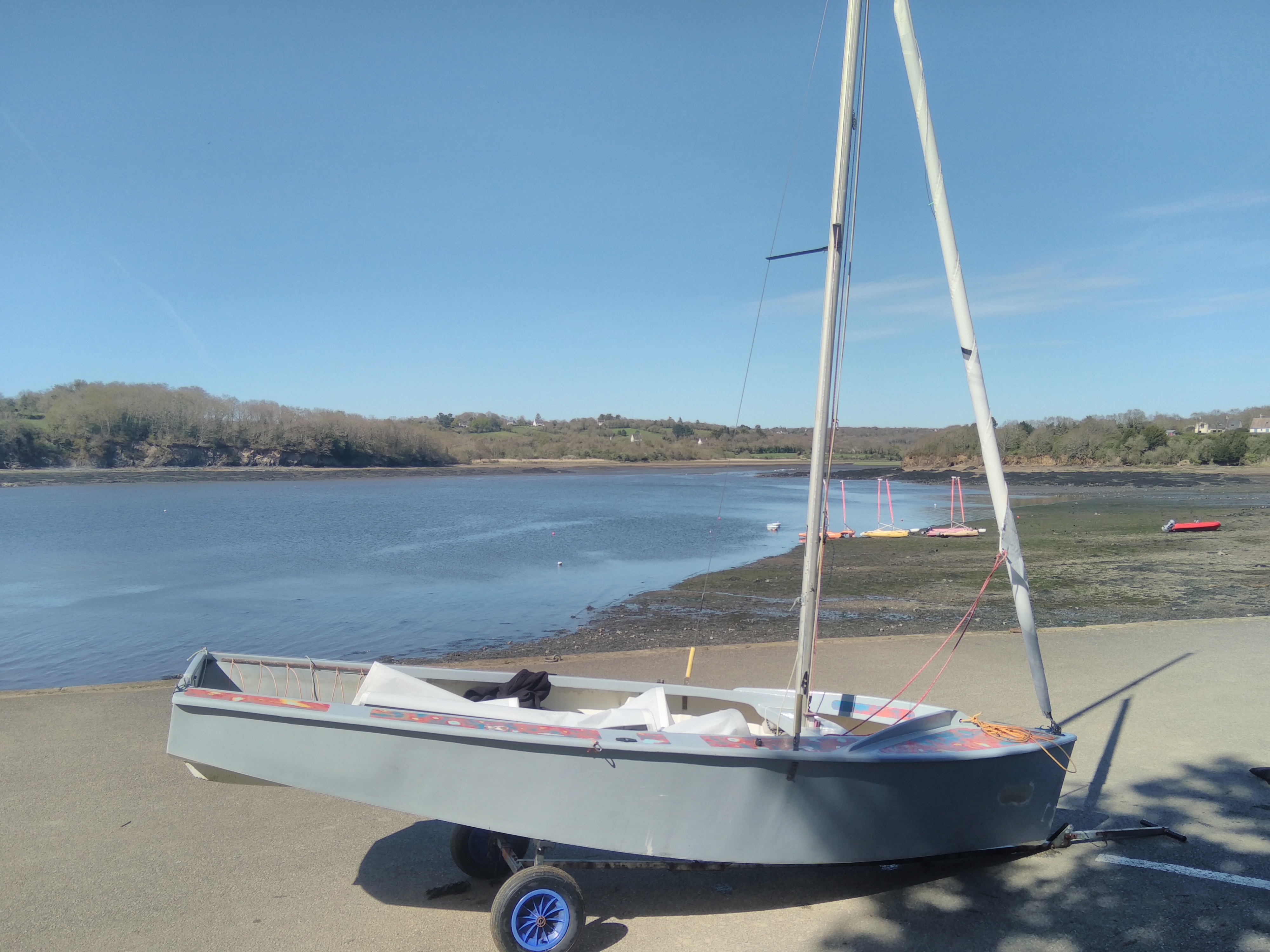 Je visite d'abord le petit port de Pors Beac'h où je mets pied à terre pour un arrêt pipi et un petit point carto. Puis nouveau départ pour atteindre en moins de 30 min le port de Rostiviec où Sylvie m'attendait sous le soleil avec la voiture et la remorque.